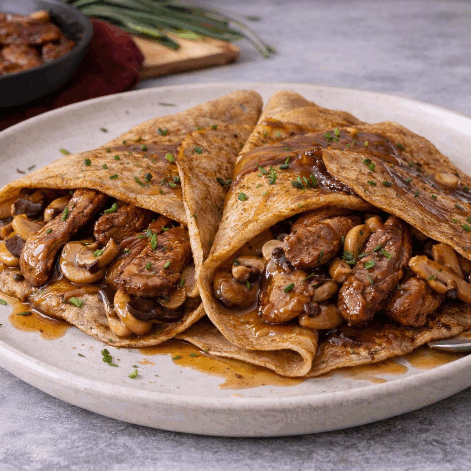 Una receta original de tortitas mitad de trigo sarraceno, mitad de trigo, con un relleno de pato laqueado con achicoria. Ideal para la Candelaria.