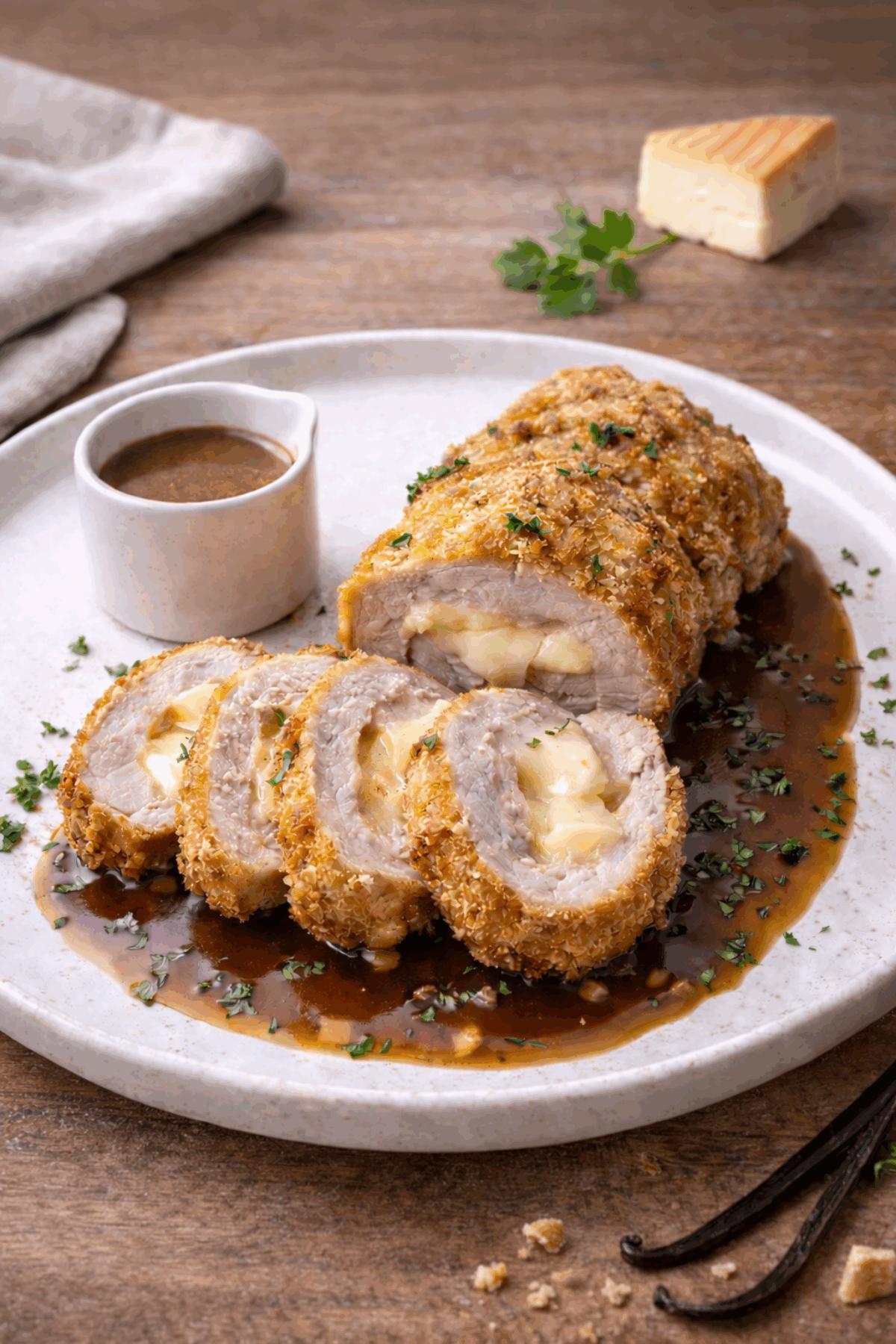 Ouvrir le filet mignon en deux dans le sens de la longueur et y ajouter des tranches de maroilles. Bien le refermer en le ficelant pour ne pas perdre le maroilles à la cuisson.