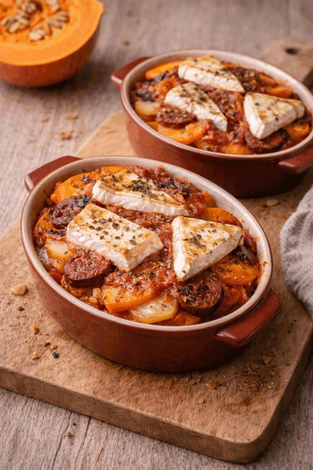 Répartissez en couches les légumes, le camembert et le chorizo dans 2 plats individuels