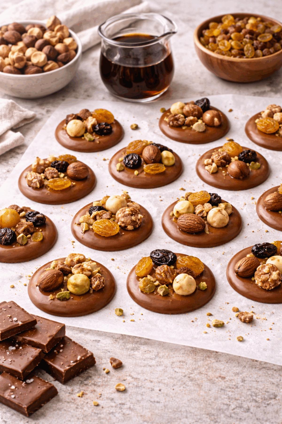 Utiliser de préférence un moule à macarons en silicone pour réaliser les mendiants ou, du papier cuisson. A l’aide d’une cuillère à café, déposer le chocolat et insérer les fruits secs sur le dessus.