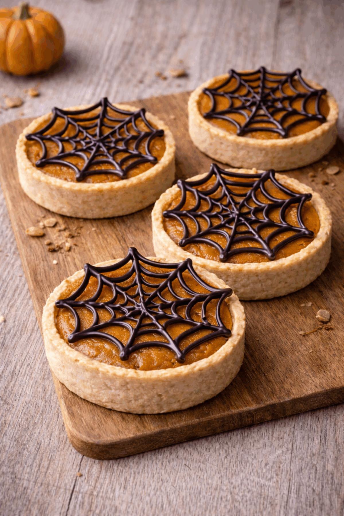 Décollez délicatement les toiles d’araignées en chocolat et disposez-les sur chacune des tartelettes.