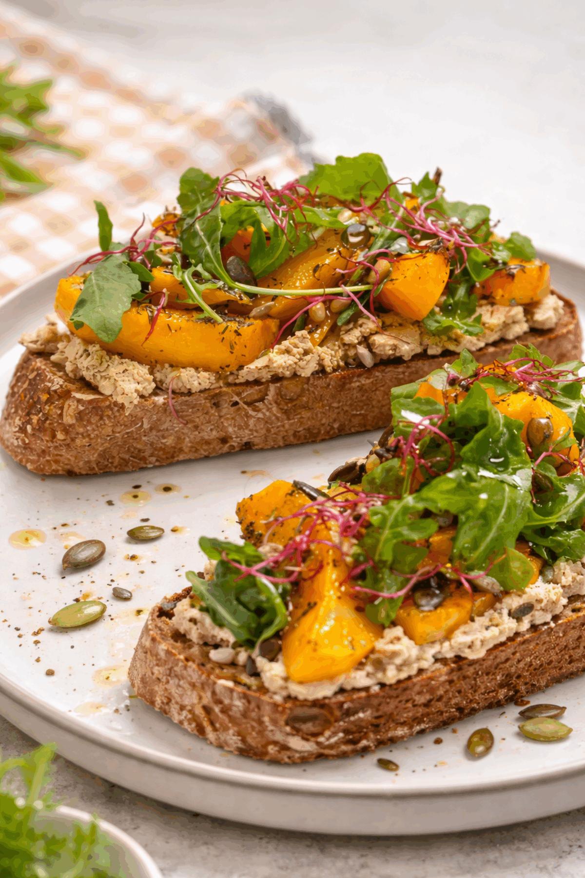 Déposer les quartiers de courge rôtis par-dessus, ajouter quelques feuilles de roquette, parsemer de graines et de micro-pousses.